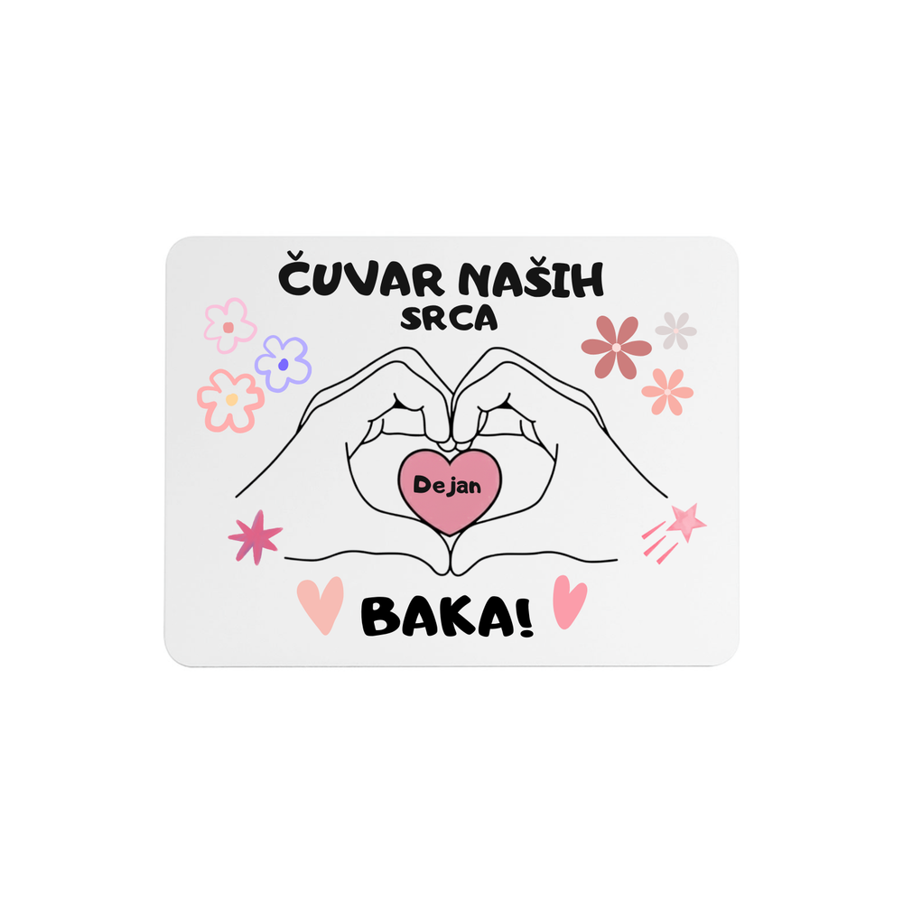 Ova emotivna slika je savršen spoj topline, ljubavi i porodične povezanosti. Ilustracija ruku koje formiraju srce i čuvaju mala srca sa imenima unuka simbolizuje bezuslovnu ljubav i zaštitu koju baka pruža svakog dana. Natpis „Čuvar naših srca, baka!“ čini ovu sliku posebnim i dirljivim poklonom.